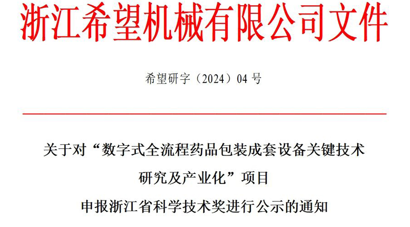 關(guān)于對“數(shù)字式全流程藥品包裝成套設(shè)備關(guān)鍵技術(shù)研究及產(chǎn)業(yè)化”項目 申報浙江省科學技術(shù)獎進行公示的通知
